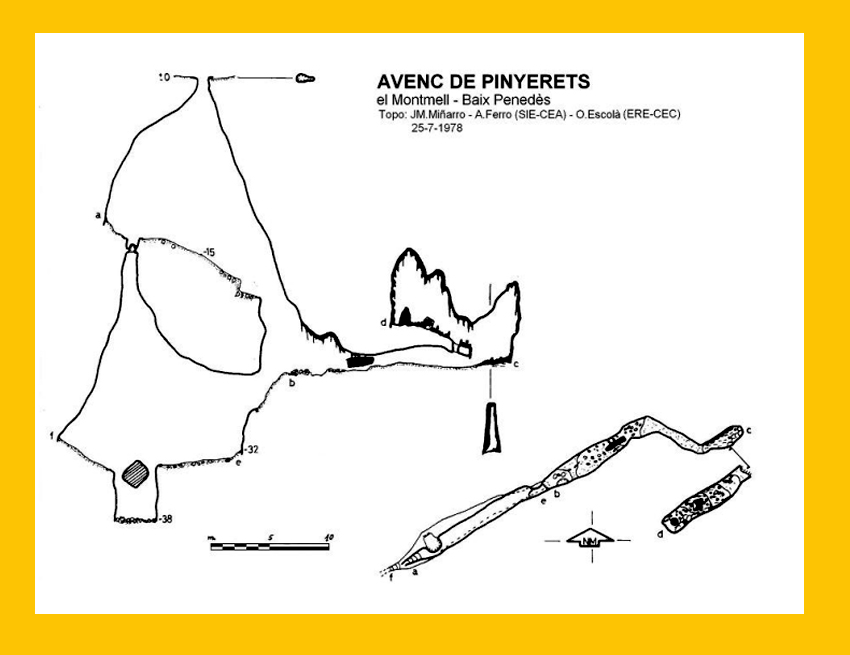 La majoria de les verticals presenten estretors de capçalera i s’eixamplen tot seguit. La galeria final és de proporcions més generoses, i entre grimpades i destrepades entre blocs ens duu fins la màxima fondària actual als -80m.